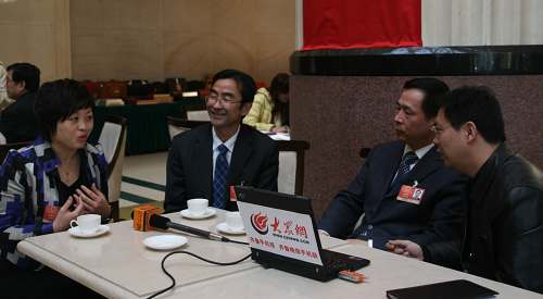 三名全國人大代表——齊魯醫(yī)院副院長孔北華(左三)、臨沂市人民醫(yī)院院長尹傳貴(左二)和山東夏津縣特殊教育學(xué)校校長袁敬華(左一)接受本網(wǎng)與大眾日報、半島都市報聯(lián)合采訪