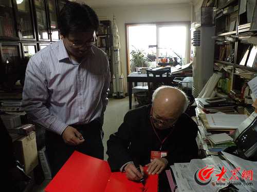 這是記者在中石先生書房用鏡頭記錄下的見聞,或許從我們的照片中,更能解讀出先生的博學(xué)與勤奮。圖為歐陽中石在大眾網(wǎng)嘉賓訪談簿上簽名。