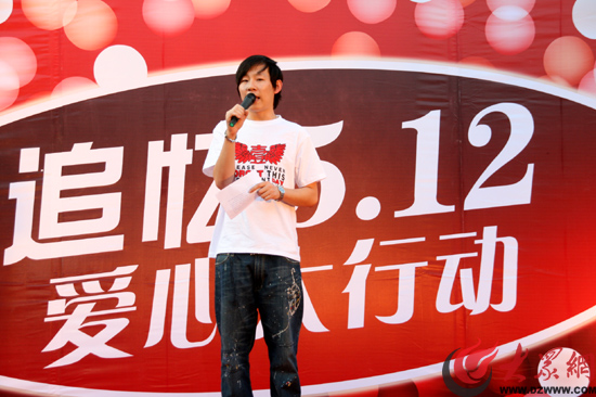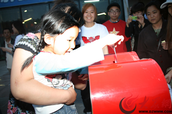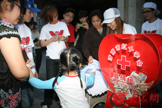 此次活動,是為了紀念汶川地震一周年的公益募捐演出。記者在現(xiàn)場看到,志愿者在現(xiàn)場義賣T恤,義賣的善款直接投入濟南紅十字會的愛心募捐箱,并最終捐給災區(qū)。
