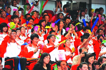 在頒獎活動現(xiàn)場,熱情的觀眾為功勛人物大聲喝彩。 本報記者 左慶 攝 |