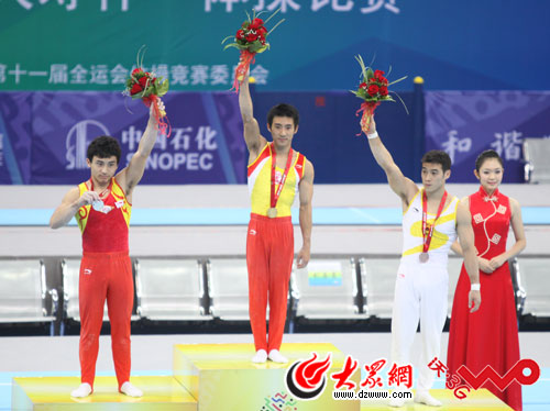 決定比賽金牌歸屬的第六輪比賽中,一路領先的張成龍在弱項鞍馬中倍感吃力,沒有完成規(guī)定動作,僅得了12.875的低分,與獎牌擦肩而過。上屆全運會個人全能冠軍呂博在其最后一輪的單杠比賽中,增加難度后有出色發(fā)揮,獲得了14.475分,最終獲得銅牌。馮喆和滕海濱在最后一輪的單杠比賽中,更是使出了渾身解數。最終,馮喆憑借實力拿下14.925分獲得亞軍,而滕海濱則憑借單杠比賽項目中拿下最高分15.225,以總成績89.350摘得今晚個人全能冠軍。