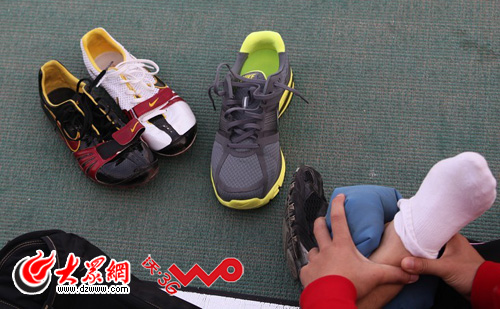 劉翔訓練穿了一雙雙色釘鞋,訓練完后他對右腳進行了冰敷。大眾網(wǎng)記者楊博 攝