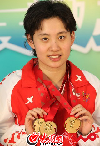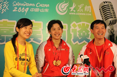 大眾網(wǎng)-聯(lián)通3G聯(lián)合報(bào)道10月24日訊(記者 隋喬 趙洪棟)今天上午,陳倩與教練王愛民一起做客大眾網(wǎng)奧體中心直播間。十六歲的她還很羞澀,微微頷首,表現(xiàn)得非常低調(diào)。她小聲說道:“游出這個(gè)成績(jī)我非常開心,發(fā)揮出了我最好的水平,這也是參加這次比賽的目標(biāo)。”她脖子上戴的三塊金牌,不時(shí)碰撞發(fā)出叮叮當(dāng)當(dāng)?shù)捻懧。不知是三塊金牌比較有重量,還是性格靦腆羞澀,陳倩總是微微低頭,照相的時(shí)候才展露一個(gè)陽光的笑容。