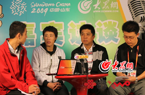 大眾網(wǎng)-山東聯(lián)通3G聯(lián)合報道(記者 馮煒程 趙新婷 趙洪棟) “這屆全運(yùn)會的比賽,對我來說,是做到了不完美的完美!秉S瀟瀟說。10月22日,女子400米的決賽中,東道主山東代表團(tuán)的黃瀟瀟以52秒23蟬聯(lián)該項目冠軍;25日,當(dāng)整個奧體中心體育場都沉浸在對劉翔的期待中,黃瀟瀟400米欄奪冠后一句“這個夜晚不只屬于劉翔,還屬于我們每個運(yùn)動員”,又感動和征服了所有的人;僅僅一天之后的26日晚上,黃瀟瀟向她的第三金發(fā)起沖擊,但是,女子4×400米接力決賽中,黃瀟瀟在最后時刻被廣東隊陳靜文追上,僅以0.01秒之差憾摘銀牌。10月27日上午,黃瀟瀟和她的教練張增惠來到齊魯晚報、大眾網(wǎng)《常回家看看》奧體中心直播間,收獲兩金一銀的黃瀟瀟用“不完美的完美”總結(jié)了她的本屆全運(yùn)之旅。
