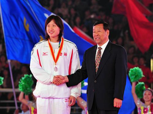10月28日,中華人民共和國第十一屆運動會在山東濟南閉幕。這是游泳運動員劉子歌(左)在閉幕式上領獎。新華社記者李紫恒攝