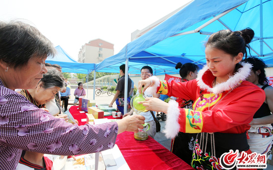 四川省自然天堂茶業(yè)有限公司總經(jīng)理何勇強(qiáng)(右)給濟(jì)南西郊的76歲老人黃伯安獻(xiàn)上羌紅