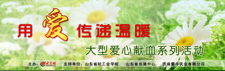 血液是生命之源,生活中每時每刻都有人需要血液。在沒有替代品的今天,臨床用血只能來自健康人自愿捐獻。每年我省臨床用血量以超過10%的速度快速增長。而秋冬季節(jié)卻是血液采集的淡季。病床上無數(shù)生命正在期待血液的救治!為幫助更多的人度過生命難關(guān),大眾網(wǎng)聯(lián)手山東輕工業(yè)學院、山東省血液中心及蒙牛公司共同發(fā)起“用愛傳遞溫暖——大型校園愛心獻血活動”,呼吁愛心人士加入其中。