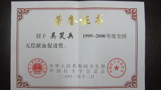 憑著扎實(shí)有效的工作和良好的社會(huì)反響,他于2002年獲得國家衛(wèi)生部、國家紅十字會(huì)授予的“全國無償獻(xiàn)血促進(jìn)獎(jiǎng)”。