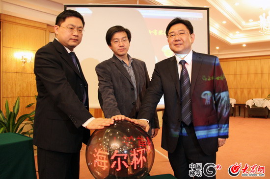大眾網(wǎng)濟南4月30日訊(記者 曹亮 趙新婷 見習記者 韋輝 韋國騫) 4月30日上午,大眾網(wǎng)聯(lián)合世博會山東館合作伙伴、世界知名品牌海爾共同發(fā)起了“海爾杯”世博笑臉有獎征集活動正式啟動。山東省上海世博會山東館輪值副館長、山東省上海世博會參展工作領導小組辦公室綜合聯(lián)絡部部長陳越,山東大眾傳媒股份有限公司董事長兼總經(jīng)理林忠禮,濟南海爾工貿(mào)有限公司總經(jīng)理李鵬共同點擊開通“海爾杯世博笑臉有獎征集”網(wǎng)絡專題。