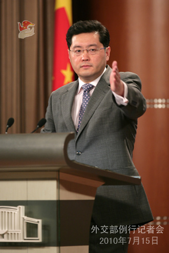 資料圖:2010年7月15日,外交部發(fā)言人秦剛舉行例行記者會。