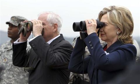 克林頓國(guó)務(wù)卿和蓋茨部長(zhǎng)在板門店非軍事區(qū)觀測(cè)對(duì)面朝鮮
