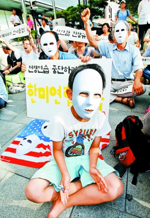 7月25日,在韓國首爾美國駐韓國大使館附近,人們參加反對韓美聯(lián)合軍演的集會。當日,為期4天的大型韓美聯(lián)合軍演開始。眾多韓國市民走上街頭,示威抗議,要求查明“天安號”事件真相,反對韓美聯(lián)合軍演。