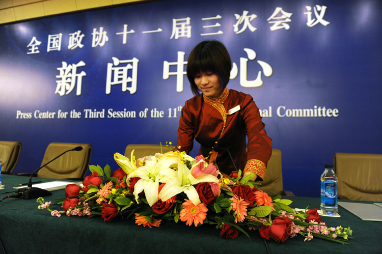 3月10日,新聞中心工作人員吳瓊在布置會議桌。