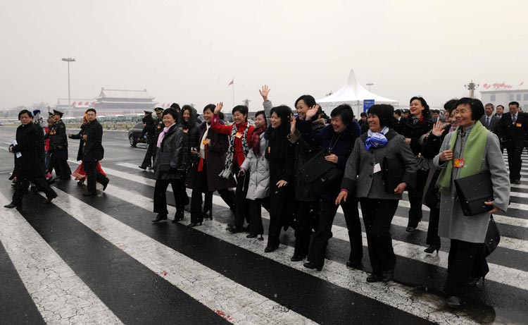 3月8日,十一屆全國人大三次會議在北京人民大會堂舉行第二次全體會議。這是全國人大代表冒雪抵達天安門廣場。