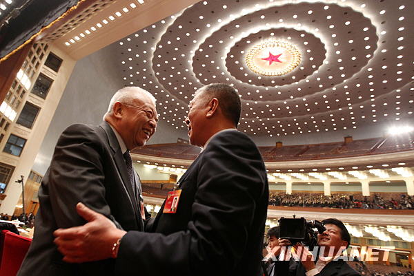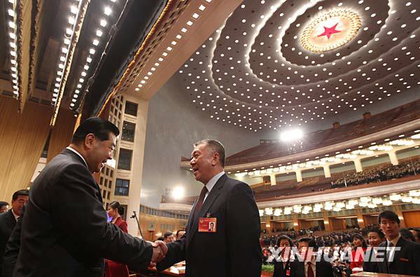 3月13日,中國(guó)人民政治協(xié)商會(huì)議第十一屆全國(guó)委員會(huì)第三次會(huì)議增選何厚鏵為政協(xié)第十一屆全國(guó)委員會(huì)副主席。這是全國(guó)政協(xié)委員向何厚鏵表示祝賀。新華社記者謝環(huán)馳攝