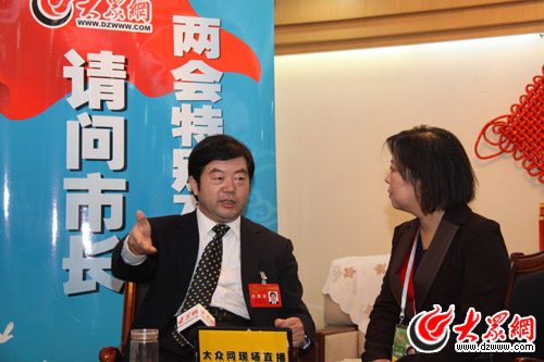 趙市長認為今年的政府工作報告非常振奮人心,侃侃而談,在簡短的現(xiàn)場采訪之后,我便邀請他參加大眾網“請問市長”欄目。趙市長欣然點頭,當即約定采訪在26日下午進行,并留下了聯(lián)系方式。