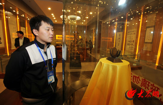 采訪團(tuán)記者瀏覽張?jiān)>莆幕┪镳^內(nèi)的獎(jiǎng)?wù)隆?/P>