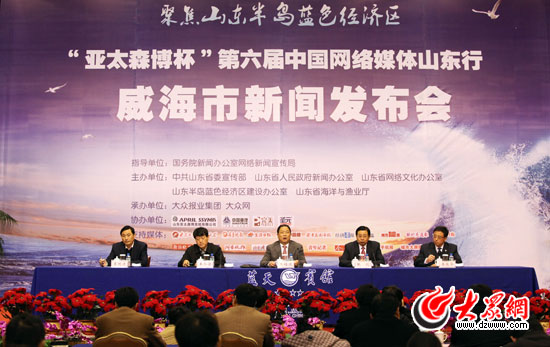 27日,采訪團在威海采訪。威海市召開新聞發(fā)布會向網(wǎng)絡(luò)媒體記者介紹威海市半島藍色經(jīng)濟發(fā)展情況。大眾網(wǎng)記者 曹亮 攝