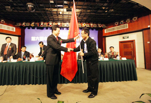 李群向采訪團代表人民網(wǎng)記者張巖授旗