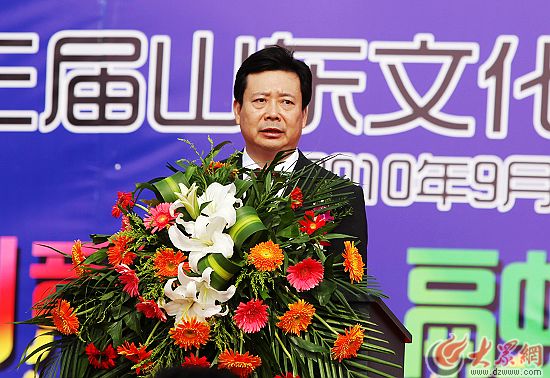 中共山東省委常委、宣傳部長(zhǎng)李群在2010第三屆山東文化產(chǎn)業(yè)博覽會(huì)開(kāi)幕式上致詞。 攝影:曹亮