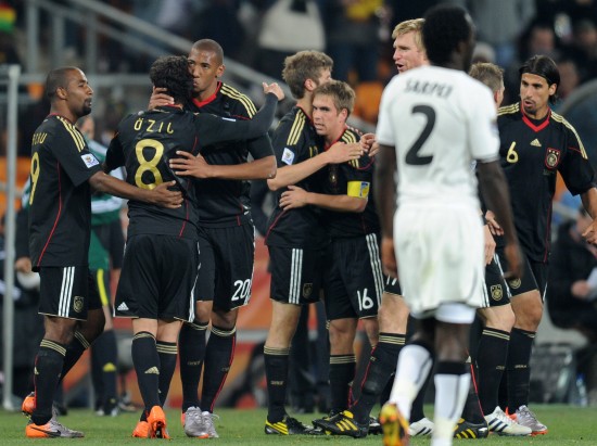 北京時間6月24日2時30分(南非當?shù)貢r間23日20時30分),世界杯D組末輪在約翰內(nèi)斯堡足球城球場展開1場較量,德國1比0力克加納。厄齊爾上半時單刀被撲出,但下半時精彩遠射攻入致勝一球。德國積6分反超對手頭名出線,1/8決賽將遭遇英格蘭;加納憑借凈勝球優(yōu)勢壓過澳大利亞,成為首支出線的非洲球隊,將對陣C組頭名美國。