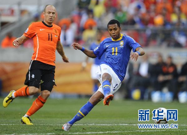 經(jīng)過(guò)比賽剛剛開(kāi)始階段的試探,巴西隊(duì)率先發(fā)力。第8分鐘巴西隊(duì)發(fā)動(dòng)邊路攻勢(shì),卡卡直傳阿爾維斯,后者從邊路殺入禁區(qū)后橫傳羅比尼奧,后者輕松推射破門(mén)。不過(guò)隨后主裁判舉旗,表示阿爾維斯已經(jīng)在接球前越位。不過(guò)2分鐘后,巴西隊(duì)還是成功率先打破僵局,梅洛中場(chǎng)送出一記妙傳撕破荷蘭隊(duì)后防線,直接找到羅比尼奧,后者形成單刀面對(duì)門(mén)將推射命中,巴西1-0領(lǐng)先荷蘭。