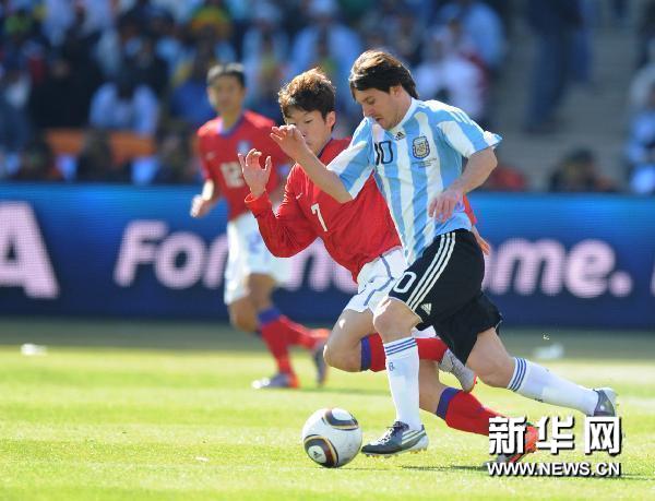 6月17日,阿根廷隊球員梅西(右)在比賽中帶球突破。當(dāng)日,在約翰內(nèi)斯堡舉行的2010年南非世界杯小組賽B組比賽中,阿根廷隊迎戰(zhàn)韓國隊。新華社記者郭勇攝