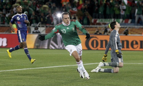 6月17日,墨西哥隊(duì)球員瓜·布蘭科(中)罰進(jìn)點(diǎn)球后慶祝。當(dāng)日,在南非波羅瓜尼舉行的南非世界杯A組第二輪比賽中,墨西哥隊(duì)以2比0戰(zhàn)勝法國隊(duì)。 新華社/路透