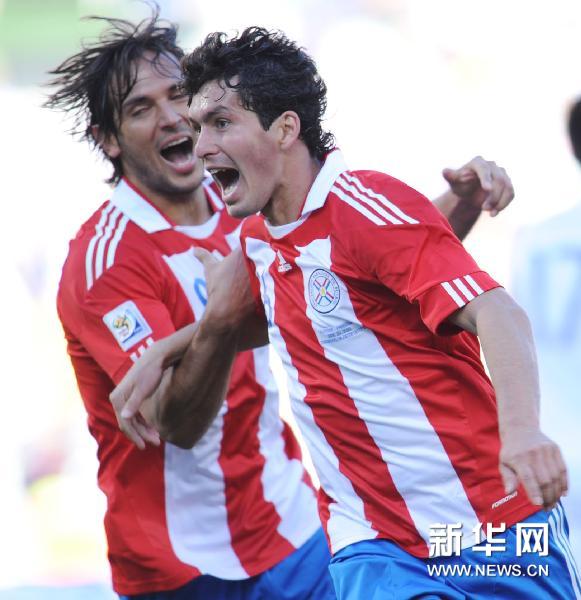6月20日,巴拉圭隊球員里韋羅(右)進球后慶祝。當日,在南非布隆方丹自由州球場進行的南非世界杯F組比賽中,巴拉圭隊以2比0戰(zhàn)勝斯洛伐克隊。