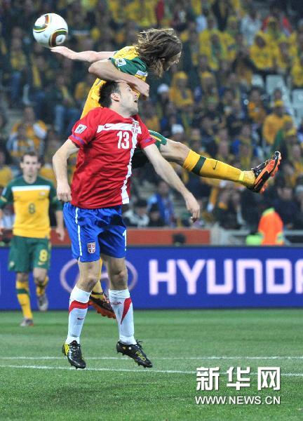 6月23日,澳大利亞隊(duì)球員肯尼迪(上)與塞爾維亞隊(duì)球員亞歷山大·盧科維奇爭(zhēng)頂。當(dāng)日,在南非內(nèi)爾斯普雷特舉行的2010南非世界杯足球賽D組最后一輪比賽中,澳大利亞隊(duì)以2比1戰(zhàn)勝塞爾維亞隊(duì),但兩隊(duì)雙雙在D組中被淘汰。新華社記者徐速繪攝