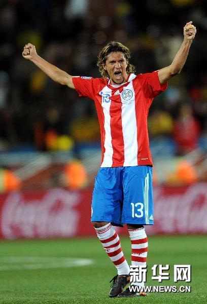 6月24日,巴拉圭隊球員貝拉在比賽結(jié)束后慶祝小組出線。當(dāng)日,在2010南非世界杯小組賽F組的比賽中,巴拉圭隊以0比0戰(zhàn)平新西蘭隊,晉級16強。新華社記者李尕攝