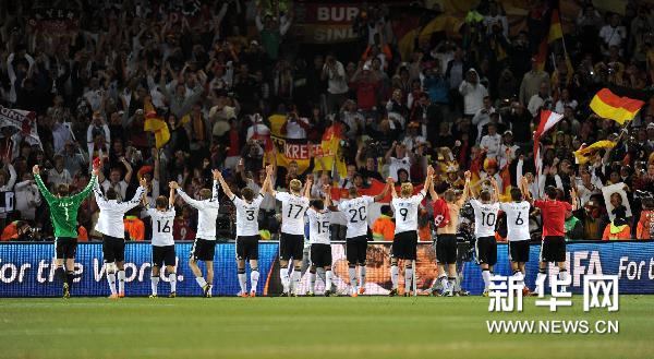 6月27日,德國(guó)隊(duì)球員在比賽后向球迷致意。當(dāng)日,在布隆方丹舉行的2010年南非世界杯八分之一決賽中,德國(guó)隊(duì)以4比1戰(zhàn)勝英格蘭隊(duì),進(jìn)入八強(qiáng)。新華社記者李尕?cái)z
