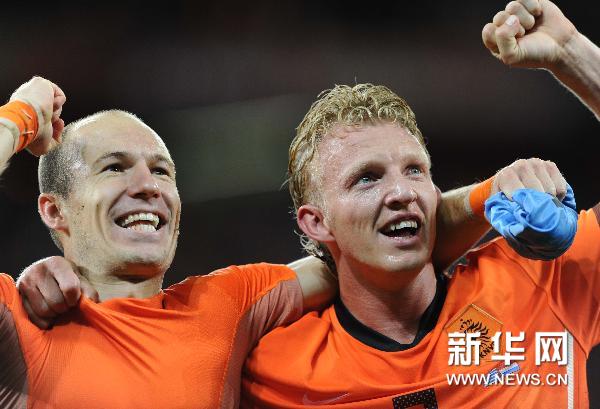 7月6日,荷蘭隊球員羅本(左)與庫伊特在比賽后慶祝。當(dāng)日,在開普敦綠點球場舉行的2010南非世界杯足球賽半決賽中,荷蘭隊以3比2戰(zhàn)勝烏拉圭隊,晉級決賽。新華社記者陳海通攝