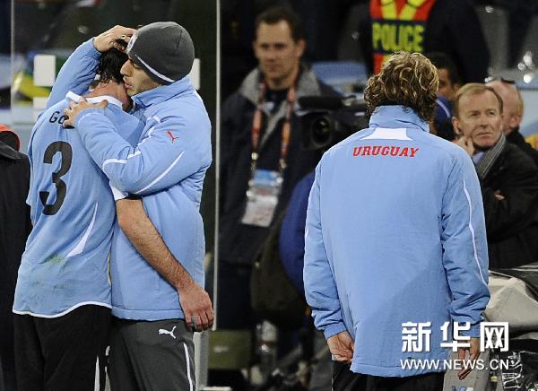 7月6日,烏拉圭隊球員路·蘇亞雷斯(左二)安慰隊友迭·戈丁。當(dāng)日,在開普敦舉行的2010南非世界杯半決賽中,烏拉圭隊以2比3不敵荷蘭隊,無緣決賽。新華社/路透