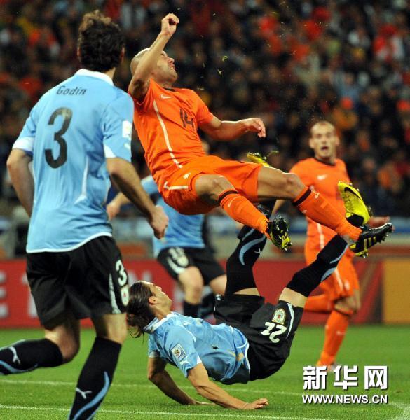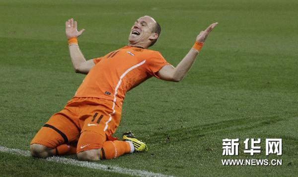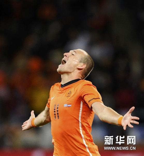7月6日,荷蘭隊球員羅本慶祝進(jìn)球。當(dāng)日,在開普敦舉行的2010南非世界杯半決賽中,荷蘭隊以3比2戰(zhàn)勝烏拉圭隊,挺進(jìn)決賽。 新華社/路透