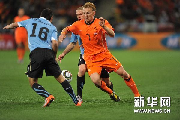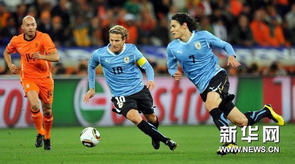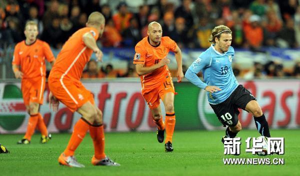 7月6日,烏拉圭隊球員迭·弗蘭(中)帶球突破。當(dāng)日,2010年南非世界杯半決賽第一場比賽在開普敦綠點球場舉行,荷蘭隊3比2戰(zhàn)勝烏拉圭隊。新華社記者楊磊攝