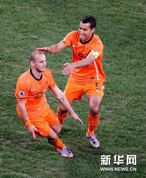7月6日,荷蘭隊球員斯內(nèi)德(左)進(jìn)球后與隊友范布隆霍斯特慶祝。當(dāng)日,在開普敦綠點球場舉行的2010南非世界杯足球賽半決賽中,荷蘭隊3比2戰(zhàn)勝烏拉圭隊。新華社記者廖宇杰攝