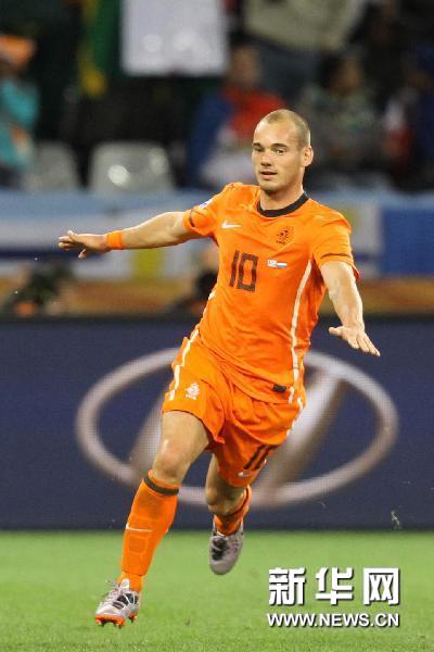 7月6日,荷蘭隊球員斯內(nèi)德慶祝進(jìn)球。當(dāng)日,2010年南非世界杯半決賽第一場比賽在開普敦綠點球場舉行,荷蘭隊3比2戰(zhàn)勝烏拉圭隊。新華社記者邢廣利攝