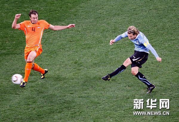 7月6日,烏拉圭隊球員迭·弗蘭(右)遠(yuǎn)射破門。當(dāng)日,在開普敦綠點球場舉行的2010南非世界杯足球賽半決賽中,荷蘭隊3比2戰(zhàn)勝烏拉圭隊。新華社記者廖宇杰攝