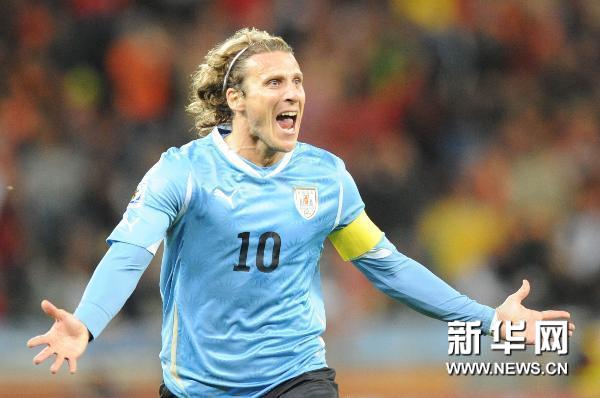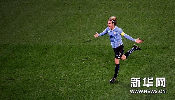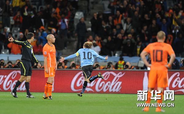 7月6日,烏拉圭隊球員迭·弗蘭慶祝進(jìn)球。當(dāng)日,在開普敦舉行的2010南非世界杯半決賽中,荷蘭隊3比2戰(zhàn)勝烏拉圭隊。 新華社/法新