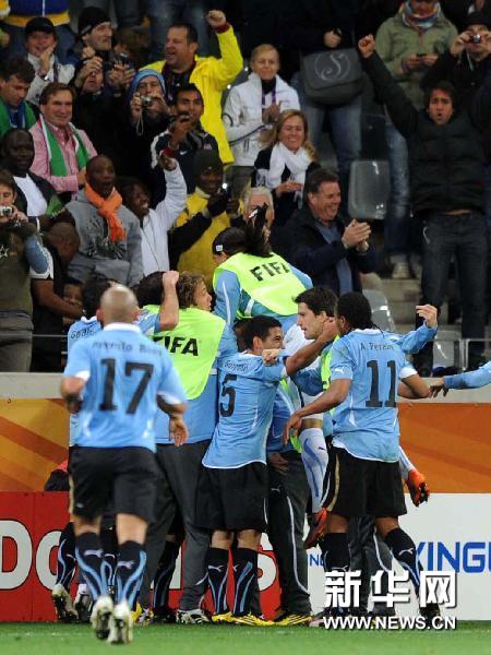 7月6日,烏拉圭隊球員迭·弗蘭進(jìn)球后與隊友慶祝。當(dāng)日,在開普敦綠點球場舉行的2010南非世界杯足球賽半決賽中,荷蘭隊3比2戰(zhàn)勝烏拉圭隊。新華社記者陳海通攝