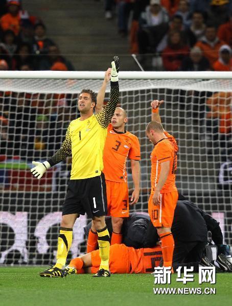 7月6日,荷蘭隊門將斯特克倫伯格(左)示意隊友受傷。當(dāng)日,在開普敦綠點球場舉行的2010南非世界杯足球賽半決賽中,荷蘭隊3比2戰(zhàn)勝烏拉圭隊。新華社記者邢廣利攝