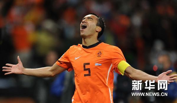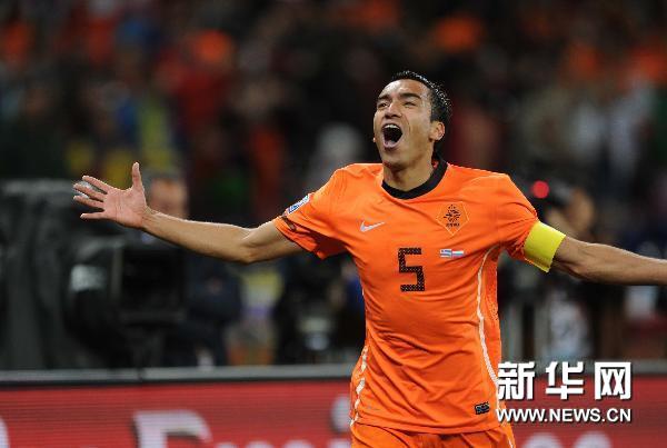 7月6日,荷蘭隊球員范布隆霍斯特進(jìn)球后慶祝。當(dāng)日,在開普敦綠點球場舉行的2010南非世界杯足球賽半決賽中,荷蘭隊3比2戰(zhàn)勝烏拉圭隊。新華社記者陳海通攝