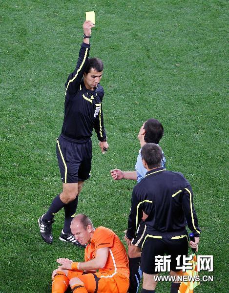 7月6日,主裁判、烏茲別克斯坦人伊爾馬托夫(左一)向烏拉圭隊球員馬·佩雷拉(右二)出示黃牌。當(dāng)日,在開普敦綠點球場舉行的2010南非世界杯足球賽半決賽中,荷蘭隊3比2戰(zhàn)勝烏拉圭隊。新華社記者廖宇杰攝