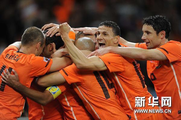 7月6日,荷蘭隊球員范布隆霍斯特進(jìn)球后與隊友慶祝。當(dāng)日,在開普敦綠點球場舉行的2010南非世界杯足球賽半決賽中,荷蘭隊3比2戰(zhàn)勝烏拉圭隊。新華社記者陳海通攝