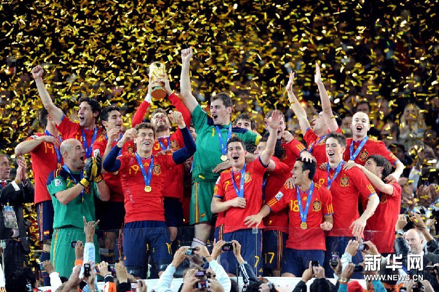 7月11日,西班牙隊(duì)球員在領(lǐng)獎(jiǎng)臺(tái)上高舉大力神杯慶祝。當(dāng)日,在約翰內(nèi)斯堡足球城體育場(chǎng)舉行的2010年南非世界杯決賽中,西班牙隊(duì)以1比0戰(zhàn)勝荷蘭隊(duì),獲得冠軍。新華社記者郭勇攝