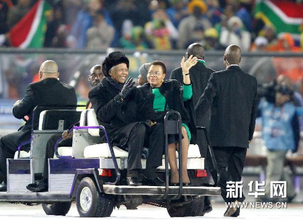 曼德拉在他的妻子陪伴下,乘坐一輛小型的敞篷車現(xiàn)身賽場(chǎng),微笑著向現(xiàn)場(chǎng)觀眾揮手致意,引來數(shù)萬名觀眾的熱烈掌聲。這是曼德拉首度公開亮相本屆杯賽。