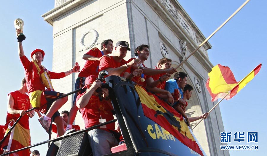 7月12日,西班牙隊球員乘坐敞篷大巴在馬德里進行游行慶祝。