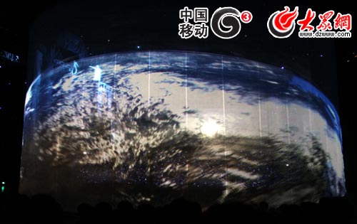 19:40,演出正式開始了。燈光熄滅,隨著一聲隆隆的巨響,巨大紗幕的上出現(xiàn)了遠古時代的畫面,臺上的表演者跟隨著不同的布景變換著服裝,演繹出人類發(fā)展的一幕幕標志性進程。伴隨驚雷般的崩坍聲,場景又變換了起來,繁星點點的夜空中飄起天使的歌聲,飾演天使的演員吊著威亞懸在空中變換著各種姿勢,穿梭在舞臺的不同位置。隨著小天使降落人間,紗幕上的圖案也從天堂逐漸變?yōu)樘、地球、上!莩鲋饾u進入主題。