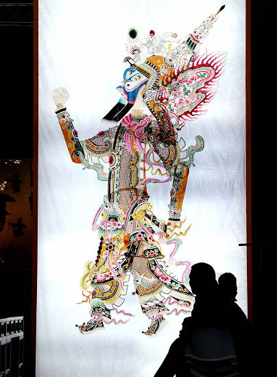 5月1日,兩名游客在皮影戲展區(qū)觀看皮影人物造型。當(dāng)日,上海世博園正式開園迎客。在“中國(guó)元素”活動(dòng)區(qū),用經(jīng)典劇目片段、傳統(tǒng)文化表演詮釋中國(guó)元素,并通過傳承人現(xiàn)場(chǎng)展示讓觀眾在互動(dòng)中感受中國(guó)元素的現(xiàn)代生命力及感染力;顒(dòng)區(qū)設(shè)在 “寶鋼大舞臺(tái)”,這里源自上海老工業(yè)區(qū)的風(fēng)貌,就是這樣一個(gè)剛性十足的區(qū)域,恰恰演繹著最為柔性的文化形態(tài)。新華社記者陳凱攝
